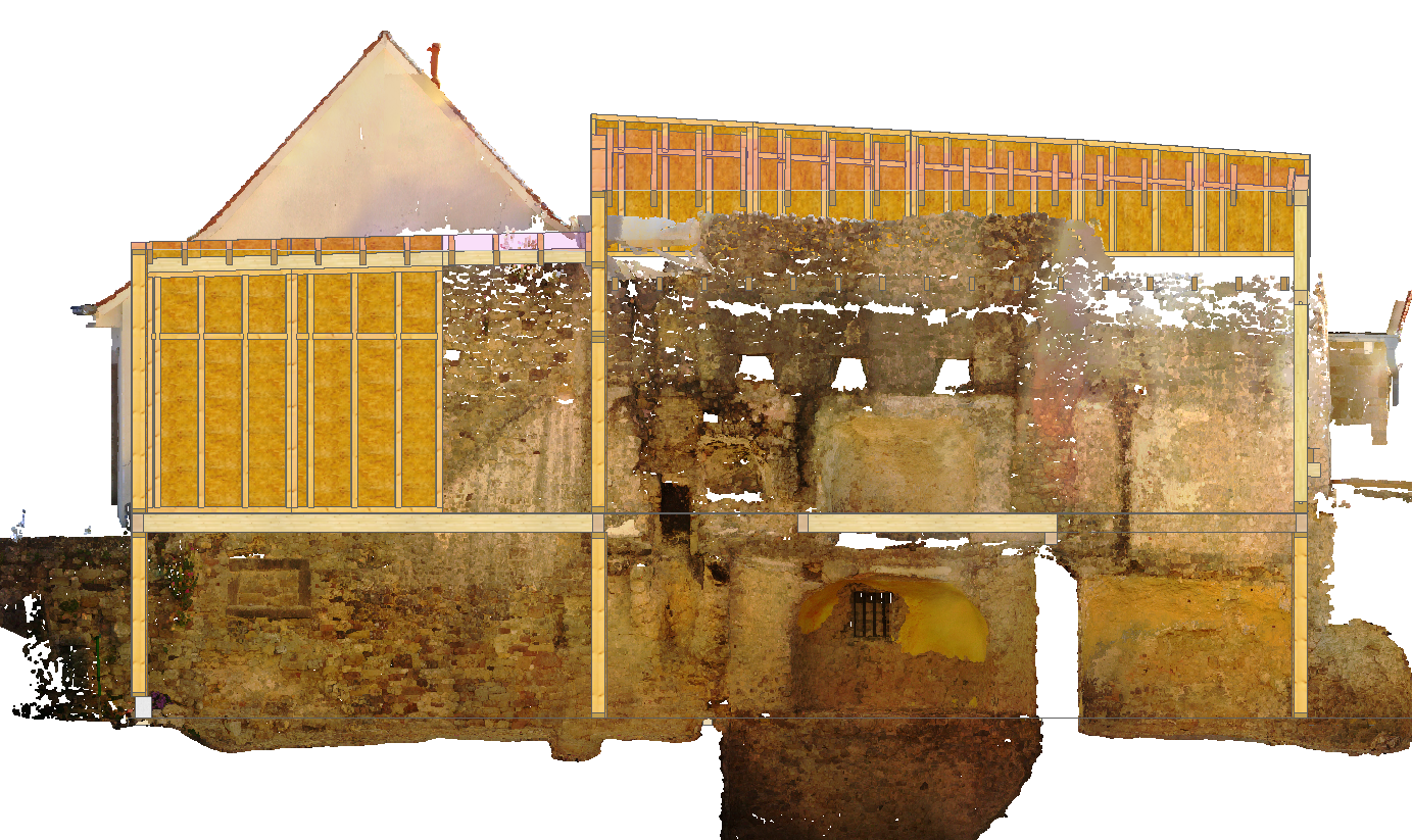 Das trifft deswegen zu, weil auch der Nachbau anstelle einer eigenen Rückwand die Stadtmauer als integriertes Bauteil nutzt. Dass diese Konstruktion, quasi als Halbschale ohne Verzahnung mit der historischen Bausubstanz (das war uns aus Denkmalsgründen untersagt worden), zur bautechnischen Herausforderung wurde, ist unschwer vorstellbar. Und genau aus diesem Grund hatten wir uns für eine komplette Holzbaulösung entschieden.