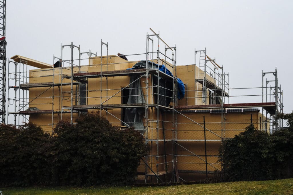 Die Wände sind geschlossen vorelementiert worden mit einer 15mm OSB Platte innen und einer 60mm Holzweichfaserplette aussen. Besonderheit: die Ständer wurden großteils aus Steico Trägern erstellt um den Wärmeschutz zu erhöhen. Um die Qualität der Wände zu verbessern wurden Schwelle und Rahmen und die Abschlussständer aus KVH Duo Nsi Wandholz gefertigt, da dieses gerader und maßhaltiger ist.